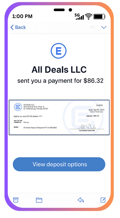 You get paid after you purchase a product from our marketplace, upload proof of purchase, submit your feedback once it arrives, and then your Deal Coins are converted to cash sent via electronic check through Checkbook.io.